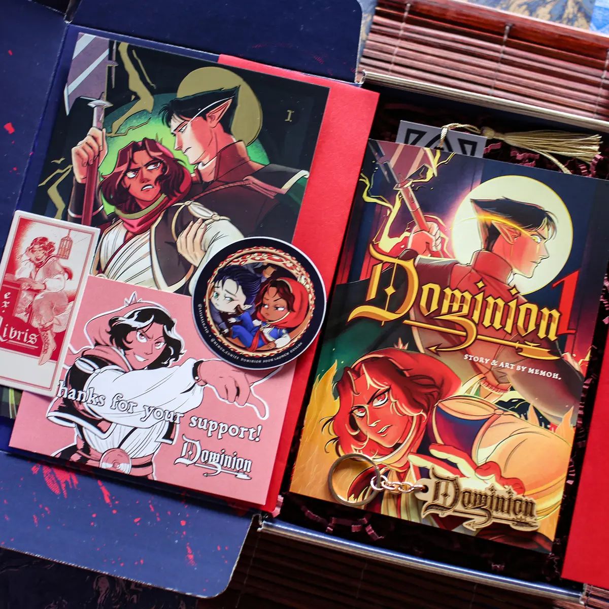 Get a book, a thank you note, a gold foil print, a bookplate sticker, an exclusive Lasersan collab sticker, a keychain, and a free bookmark - all in a custom-printed Dominion box!